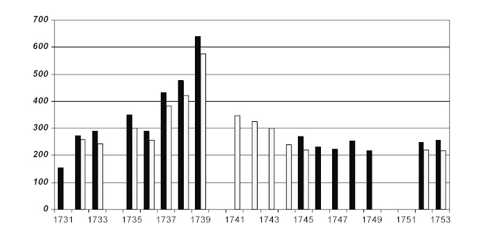 Für die Jahre 1734, 1740/41 und 1750/51 existieren keine Aufzeichnungen mehr.